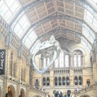 ホールの頭上にある大きなシロナガスクジラの骨格標本に