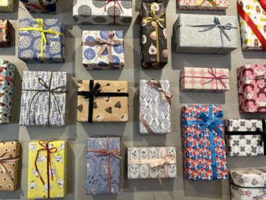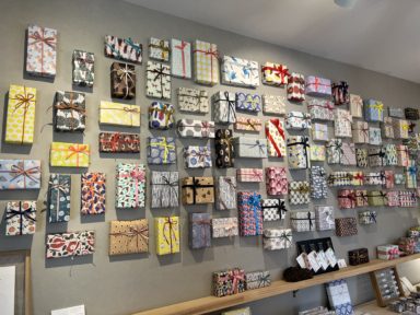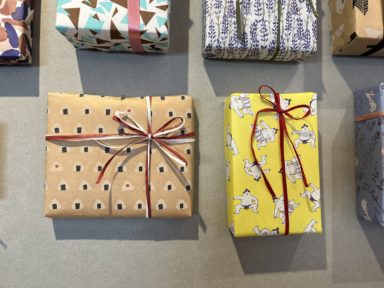 こちらには、REGARO PAPIROさんオリジナルのラッピングペーパーで包装されたプレゼントの小箱が壁一面に飾られています。