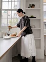 こちらのスカートは『CHECK&STRIPE my favorite 私の好きな服』(主婦と生活社)でご紹介しているパターンで、ひとつひとつミシンでスカラップを作るのですが、その少しいびつになるスカラップがまたかわいいのです。