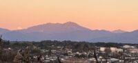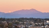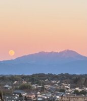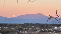 町を見下ろせる丘の上から夕日に映える雄大な市房山(熊本県と宮崎県にまたがる)を眺めていたところ、しずかに山頂から昇ってくる月を発見。
