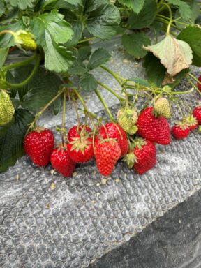 いちご狩りに行ってきました。神戸でいちご狩りといえば「ニ郎いちご」北区のニ郎地区にあるいちご農園で育てられたいちごの総称だそうです。あまり市場ではお見かけしない「章姫」「紅ほっぺ」などが食べられます。神戸市北区は、神戸店がある三宮周辺の市街地エリアとはうって変わって、田園風景が広がるのどかな場所。いちごが名産地の自分の田舎を思い出させてくれます。