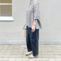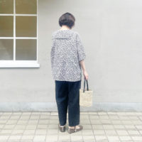 C&S sunny daysコットンのブラックで作ったシンプルテーパードパンツは、ゆったりしたシルエットが気に入っていて、季節ごとに生地を変えて作っています。